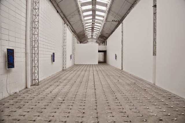 In its art impotence we need not obey or believe, and instead pick at the minutia of its rhetoric, sampling it in the political limpness of a poem, like Holzer’s Truisms, tweets flashing on courier’s white aluminum. Poster removed from action, placed in the gallery, looking good but not quite working. From a decade when Chris Wool was screaming unheard in silent graphics, to today as Fend yells in varying green hues, some red; it’s less call to action but instead gloss in the cybernetic reach of slogan marketing, maps of cerebral gaming. Winning the hearts and minds. The way its breath enters you, like Jonathan Horowitz’s pedestalled tofu, slowly getting slimy. Bruce Nauman in his skyplane writing on the blue Pasadena sky, “Leave the land alone.” The invocation of James Bond feels spot on in its admittance of our land of fiction: