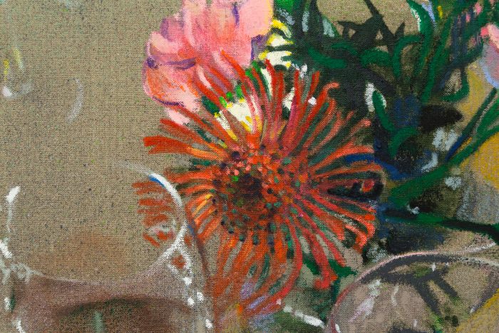 Whoa when was the last time you saw detail shots in painting documentation? Pointing at the paint itself seems to come with Simon's slow move towards seriousifcation, way long ago Simon used to make funny paintings, mentioning 4chan even, the subject matter occasionally Tansey-esque. Comedy which seems to been have shored up to the much more artworldly common form, that quiet awkwardness, that flat footed, punchline free form of humor of like Nauman, say, and you could make an argument Simon's now aren't even actually comical at all, that the traditional scumble technique on view would maybe even point to them being anti-funny since technique generally isn't associated with humor (as if comedians weren't putting hours into craft) comedy is supposed to appear effortless and these appear - and with detail are asked to be noticed as - labored. Jokes aren't really prone to art. A joke is spent and exhausted. So an artwork with its requisite implicit promise of eternalness can't really make a joke without implying that it too will one day be depleted. Prince's real joke is that the paintings keep telling the same joke for years and years stupidly. Maybe it's with more time that the joke can still survive being even more slight, maybe the joke is painting flowers at all, maybe it's painting them with conviction, a real slapstick subject for contemporary art.